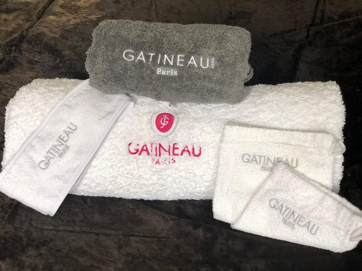 Brand: GatineauLined Bundle Includes 1 x Large White Gatineau Towel,1 x Small Grey Gatineau Towel,2 x White Gatineau Mitts,1 x White Gatineau Headband.