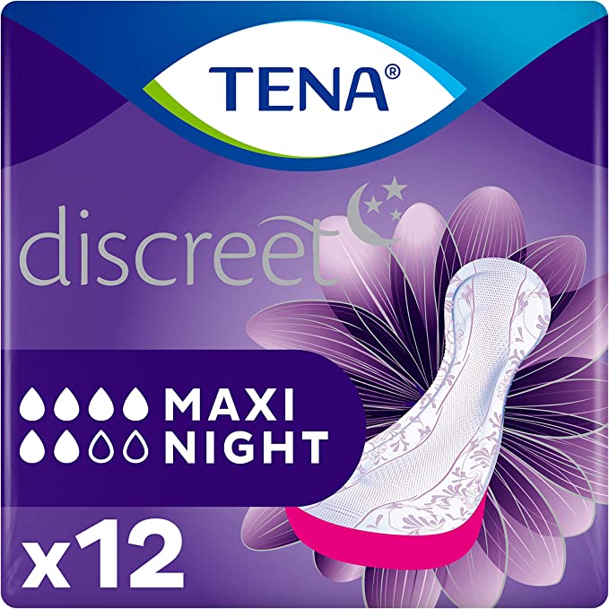 Tena Discreet Maxi Night Duo (12). TENA Maxi Night incontinence pads designed with extra length and width. Tena Lady Maxi Night with Lie Down Protection offers superior night time protection.. The extra length and width at the back gives extra coverage and prevents leads when you are lying down giving you a good nights sleep.