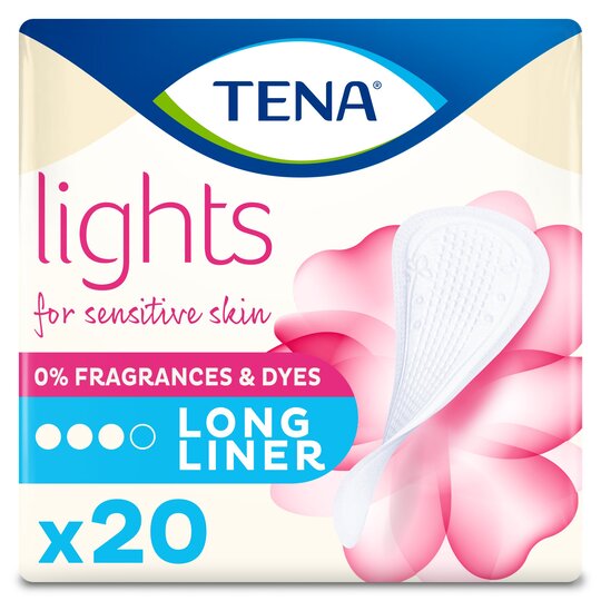 Tena Lights Bladder Weakness Long Liner (20). As thin as the regular liner but longer for extra protection. With a silky soft textile covering that is gentle against the skin. Discreet, comfortable & fast absorbing. Fast absorbing protection for sensitive skin with 0% fragrances and dyes. Designed for light bladder leakage.