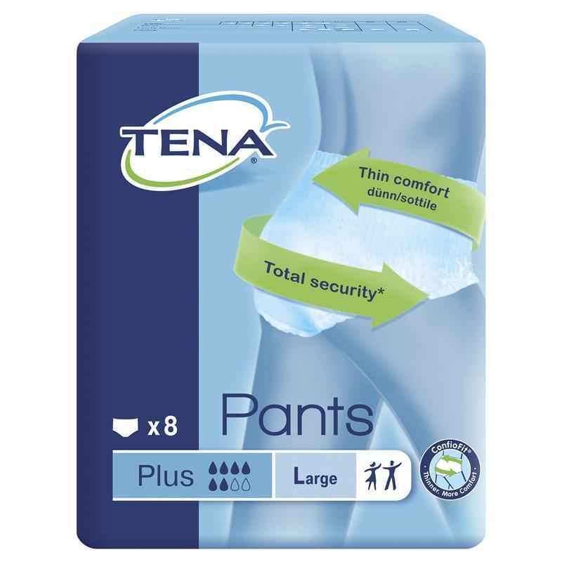 TENA Pants Plus Incontinence Pants – Large 100-135cm (8). TENA Pants Plus Incontinence Pants Fit Size Large 100-135cm.. TENA Pants Plus are white soft and comfortable, disposable incontinence pants for men and women with pull up fit just like regular underwear. With a close body-fit and textile like, breathable materials they are designed for soft comfort. Unlike standard adult diapers, TENA Pants Plus have a highly absorbent core that quickly and effectively locks in liquid for total security.. When worn, our thin and flexible core shape forms two absorption chambers, also known as the Dual Absorption Zone, that efficiently channel moisture away from the body. Integrated leakage barriers for additional security Reliable protection against leakage for an active lifestyle and confidence, no matter the situation.. Triple Protection from leaks, odour and moisture.. Dual Absorption Zone for optimum dryness and protection. Soft and breathable material for soft comfort. Large 100-135cm