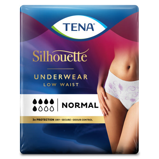 TENA Silhouette Normal Low Waist Blanc – Incontinence underwear (5). Size Large Fits: EU 44-54 / UK 16-22. TENA Silhouette Normal Low Waist Blanc have a stylish low waist design with micro-stretch fabric and feminine, all-round pattern that make them look and feel just like regular underwear. These disposable incontinence panties for women are designed to protect against moderate bladder weakness.. The reliable absorbent core quickly locks in moderate leaks and protects against odours for incredible discretion. With their elegant, fashionable look, you’ll discover just how beautifully discreet protection against incontinence can be.. Just like underwear. Protects like TENA.. Outstanding security. Feminine design by a lingerie designer
